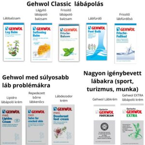 - Gehwol ápoló lábdezodor pumpás (TSF068): Hosszan tartó frissességet biztosít, semlegesíti a szagokat, miközben finoman ápolja a láb bőrét.