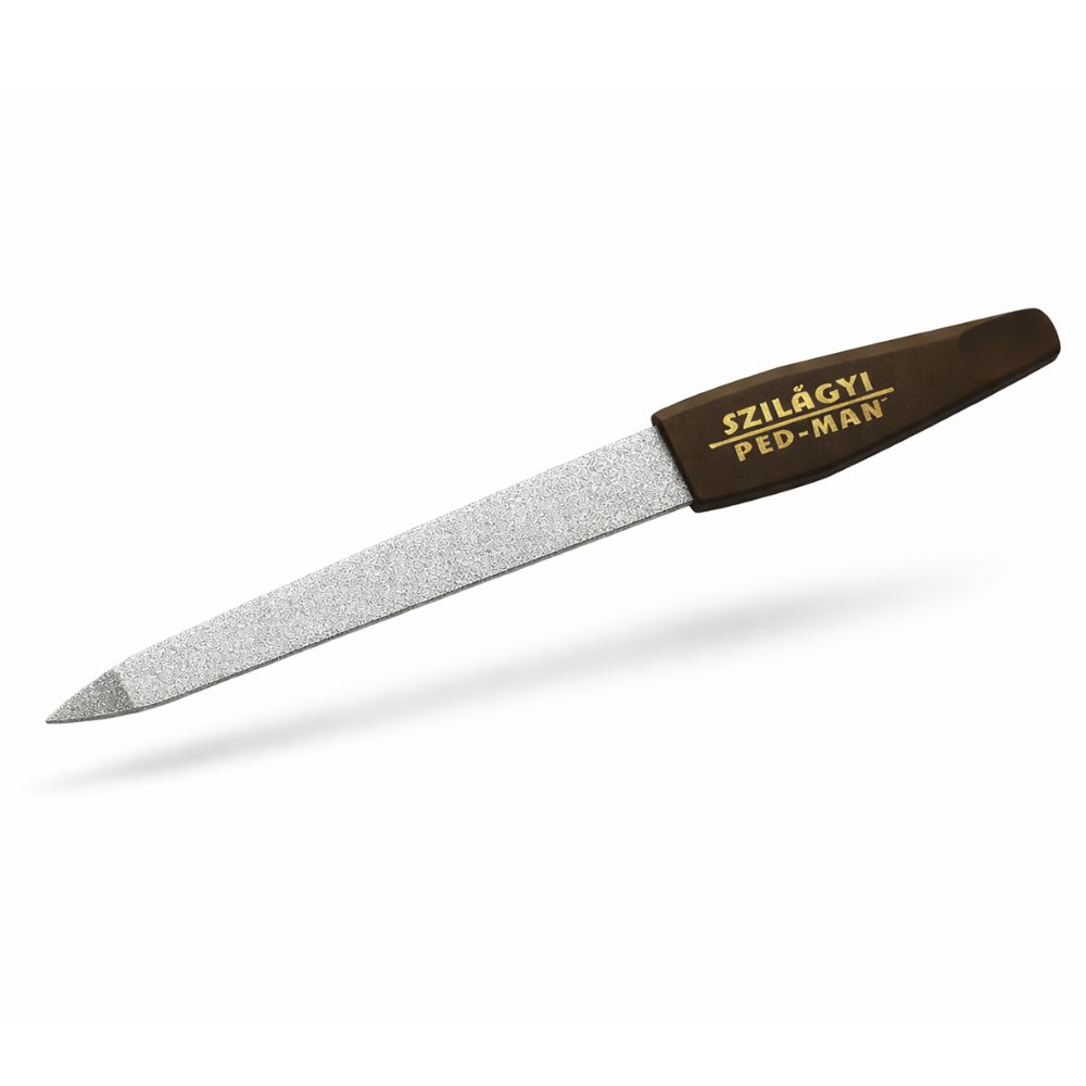 18 cm-es manikűr reszelő gyémántporos fém felülettel, amely hatékony, mégis kíméletes formázást biztosít otthoni és professzionális körömápoláshoz.